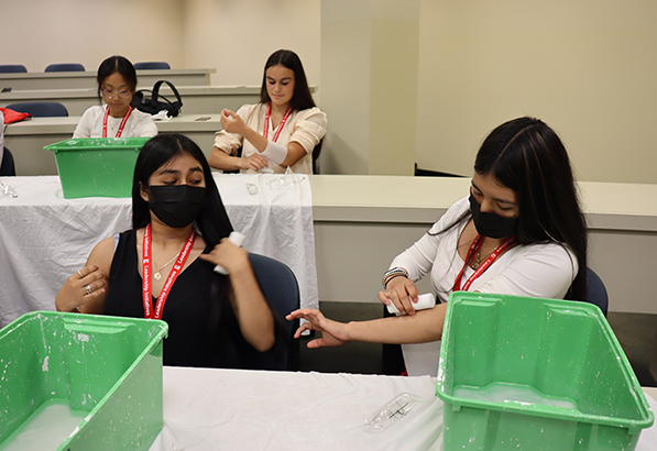 In one of the leading interactive activities of the internship, I learned and practiced multiple suturing techniques on a human-skin model.