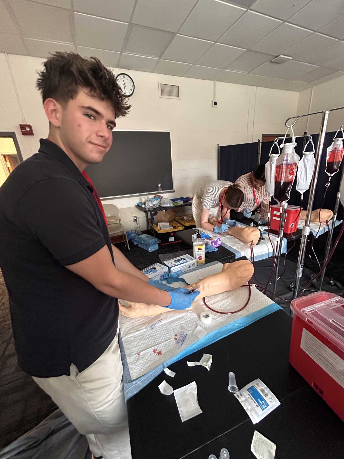 I trained in phlebotomy using a realistic arm simulator, practicing needle placement to draw blood from veins that mimic real vein-wall resistance.
