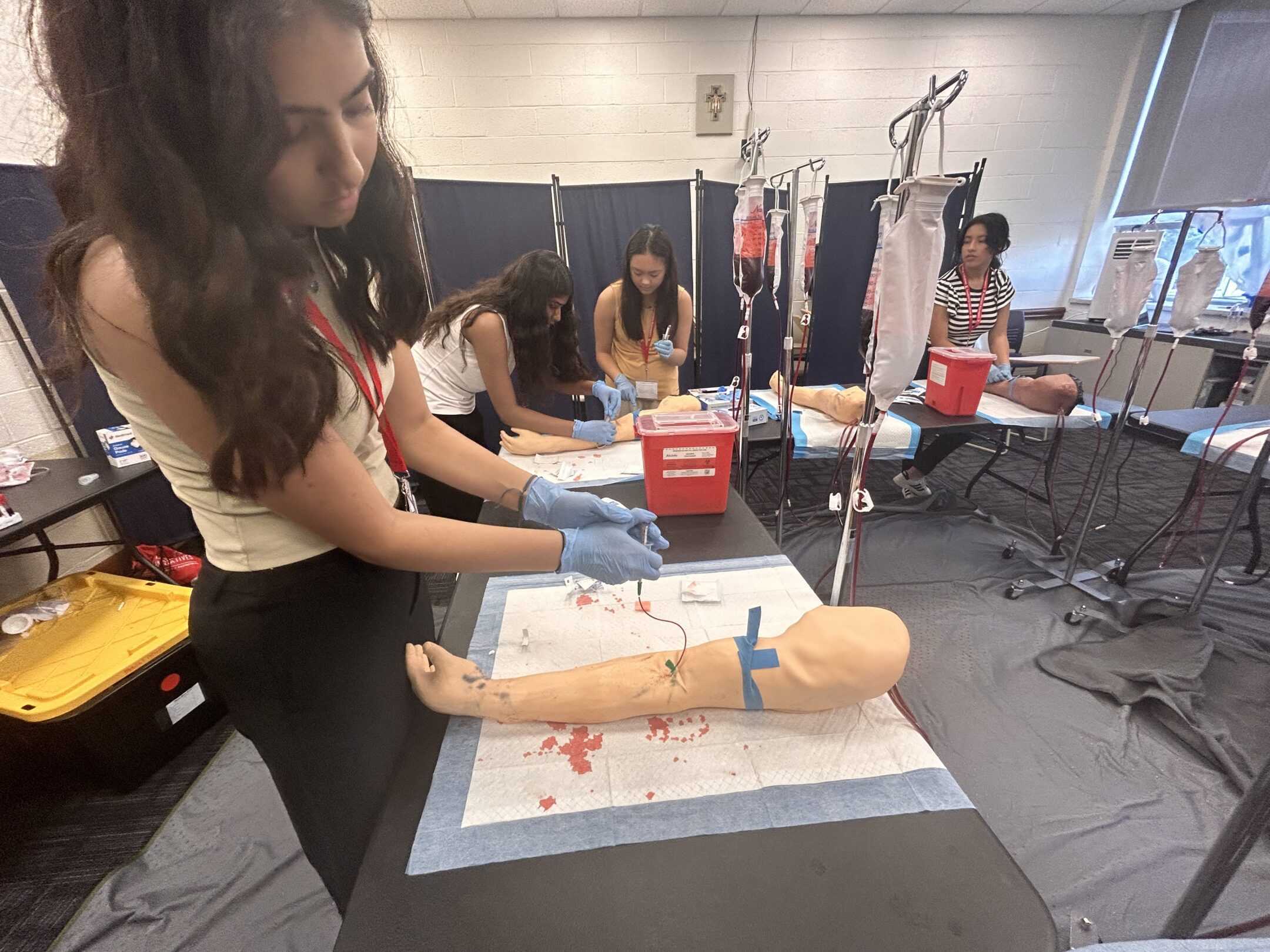I trained in phlebotomy using a realistic arm simulator, practicing needle placement to draw blood from veins that mimic real vein-wall resistance.
