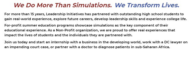 Leadership Initiatives offers the leading experiential education programs for high school students with endorsements from the Microsoft Youthspark Program, the Starbucks Foundation, the International Youth Foundation, GlobalGiving, PrepScholar, and the Future First Foundation.